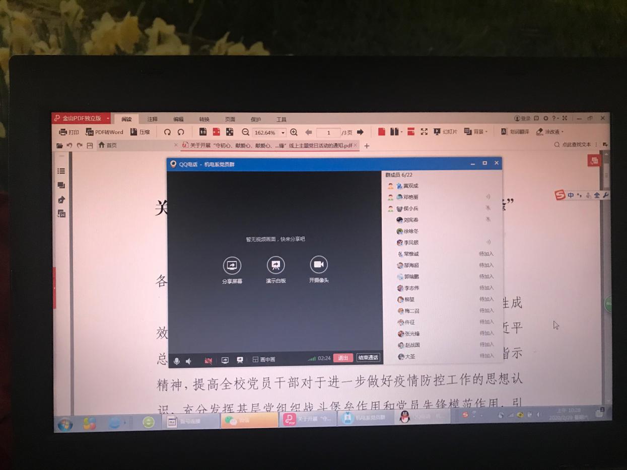 根据公司党委组织部《关于组织开展“守初心、献爱心、战疫情、做先锋” 线上主题党日活动的通知》要求,公司党总支在2020年2月29日上午10点召开了总支委会,共同学习了通知要求,并对本次主题党日活动进行了部署。教工党支部和员工党支部分别于2020年3月1日下午3点和2月29日下午5点分别通过“叮叮”视频和qq群分享屏幕召开了“守初心、献爱心、战疫情、做先锋”线上主题党日活动,现总结如下: